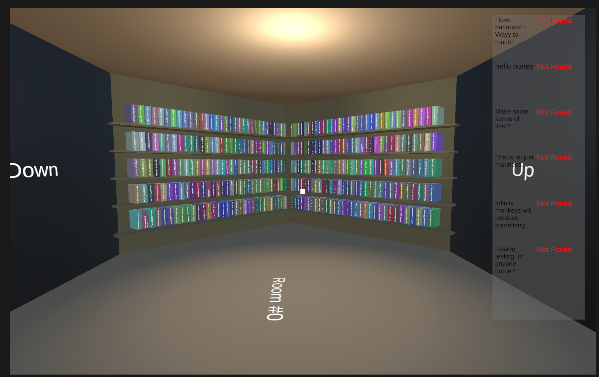 A game about the library of babel that perfectly replicates the original idea literally. Future versions may use "fake" pages to display objectives, but the library is a true library of babel that is generated infinitely .